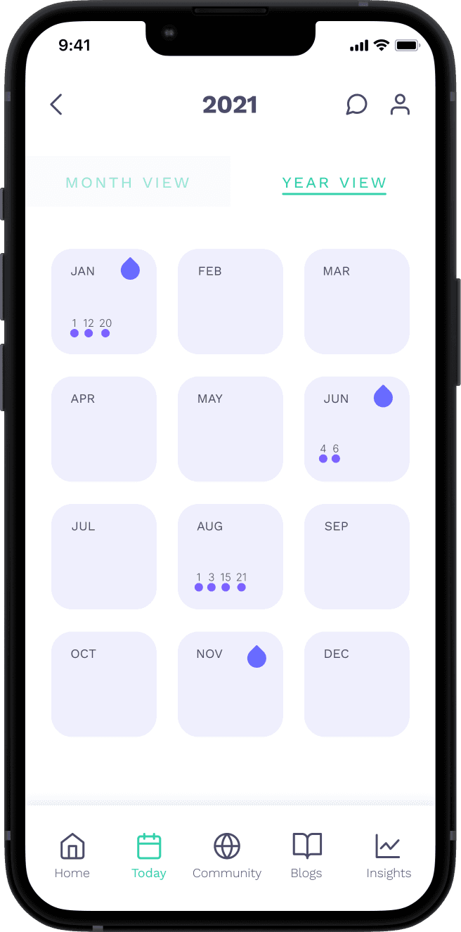 To address the challenge of tracking irregular cycles, the app's Home Page features a circular year view instead of a typical one-month cycle. Users can track both their periods and habits, with the months they menstruate highlighted on the calendar.