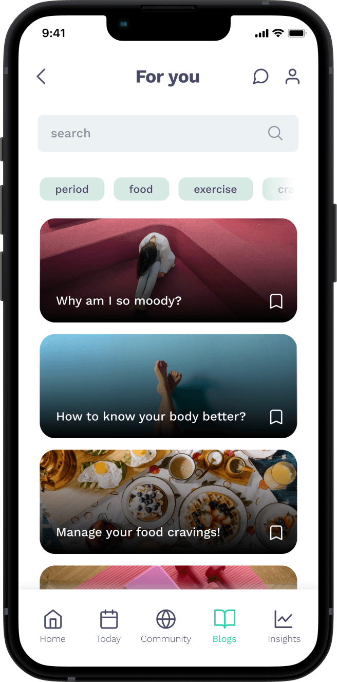 The app offers personalized blog suggestions based on logged symptoms and lets users filter blogs by tags or search specific topics.